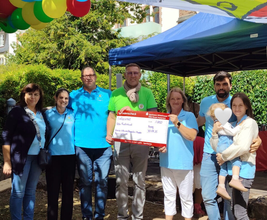 Die Villa-Kunterbunt, das Nachsorgezentrum für Krebs-, chronisch- und schwerstkranke Kinder und deren Familien am Klinikum Mutterhaus, feiert 25. Jubiläum. Zu diesem Anlass veranstalteten sie, um die Villa herum, ein liebevoll gestaltetes Familien- und Freundesfest. Ein buntes Programm für Groß und Klein mit Spiel, Spaß und großer Tombola. Wir sind sehr stolz, schon lange Hand in Hand mit der Villa zusammenzuarbeiten. Um dieser Zusammenarbeit Ausdruck zu verleihen, spendet der Verein 1000,00 € an die Villa-Kunterbunt Trier.